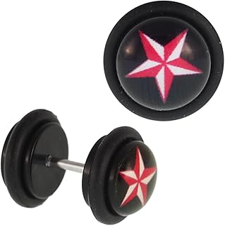 Fake Piercing Plug schwarz Stern rot und weiß Gummiring 7 mm